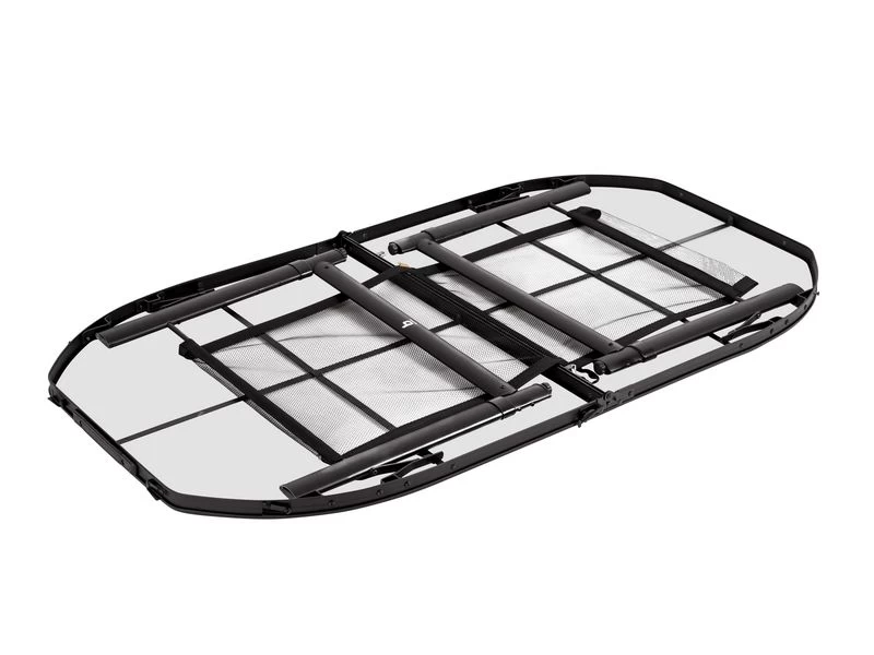 Compact als koffermodel op te bergen door de afneembare poten en een deelbaar blad.