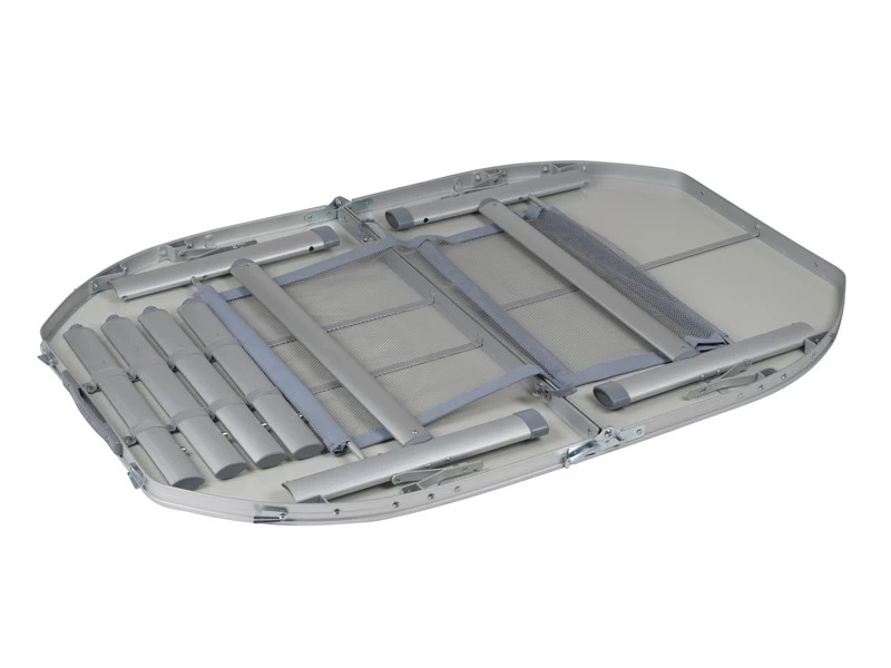 Een zeer stabiele ovalen campingtafel met een watervast en hittebestendig tafelblad. Deze tafel heeft verstelbare poten, stelschroeven voor extra fijnstelling en een deelbaar tafelblad. Hierdoor is de tafel eenvoudig op te vouwen tot koffermodel. Gemaakt van lichtgewicht aluminium met een watervast en hittebestendig tafelblad. Onder het tafelblad is een net bevestigd om spullen op te bergen. Ingeklapt (lxbxh): 80x60x7 centimeter.