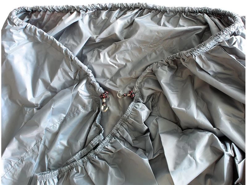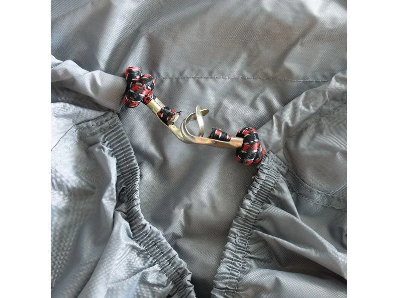 De hoes is vervaardigd van een stevig polyester materiaal en is voorzien van elastiekband met 2 metalen haken om de hoes goed om de fietsen en aan het frame te bevestigen.