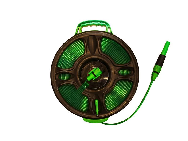 slanghaspel 15mtr, opgerold te gebruiken door open slang structuur met regelbare spuitmond